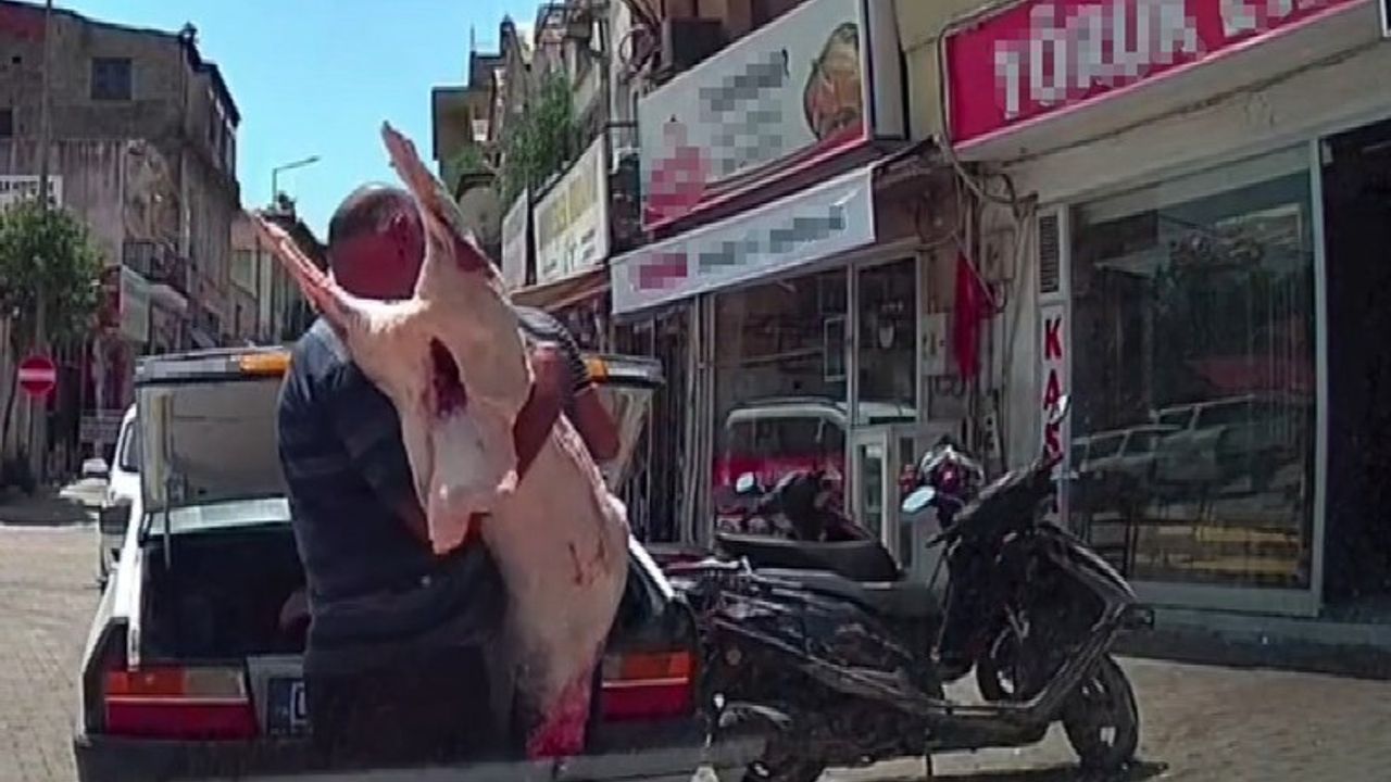 Görüntülerde, 3 küçükbaş hayvanın etinin eldiven dahi kullanılmadan araçtan çıkarıldığı ve gelişi güzel şekilde taşındığı görüldü. Söz konusu anlar bir vatandaş tarafından cep telefonuyla kayda alındı.
