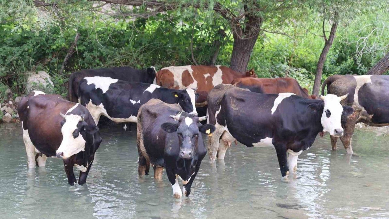Kent merkezinde olduğu gibi Kozan’da da sıcak hava yaşamı olumsuz etkiliyor. İlçe genelinde yüksek sıcaklık nedeniyle dışarıda insan yoğunluğu azalırken, Alapınar Mahallesi’nde otlayan büyükbaş hayvanlar serinlemek için akarsulara girdi.