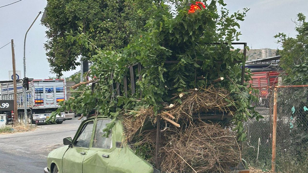 Binek otomobilin üzerine yerleştirdiği büyük ağaç dallarıyla trafikte ilerleyen bir sürücü, hem kendi canını hem de diğer sürücülerin güvenliğini tehlikeye attı.