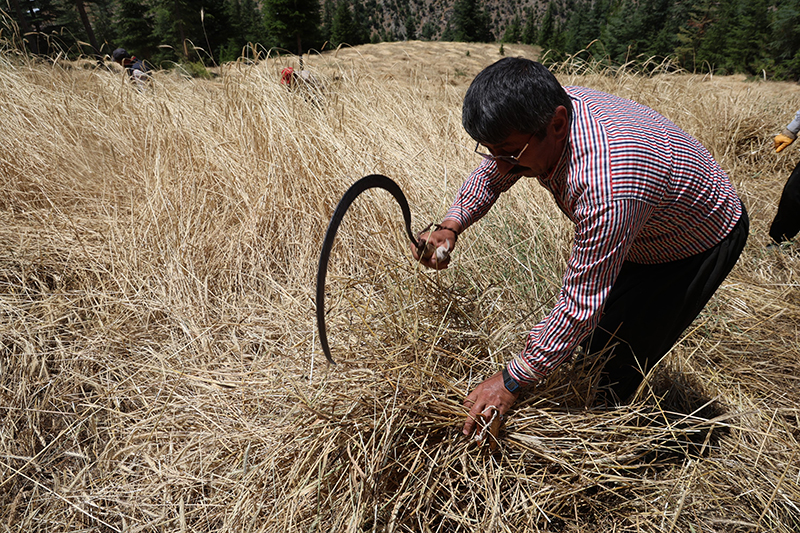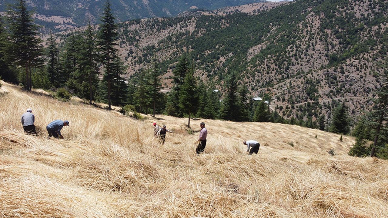 800 rakımlı Gaffaruşağı Mahallesi’nde başlayan hasatla birlikte vatandaşlar, Anadolu’da asırlardır kullanılan en eski tarım aletleri olan ellik ve orakla emek yoğun bir çalışma yürütüyor. Hasat edilen buğday, satılmadan un haline getirilerek evlerde ekmek yapımında kullanılıyor.