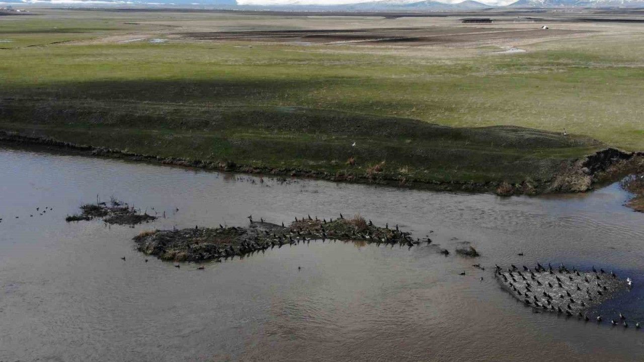 Kars’a gelirken yorgun düşen ve Kars Çayı’nda oluşan adacıklarda dinlenen karabataklar, havadan görüntülendi. Bir süre dinlenen karabataklar, daha sonra yazı geçirecekleri bölgeye kanat çırptı.