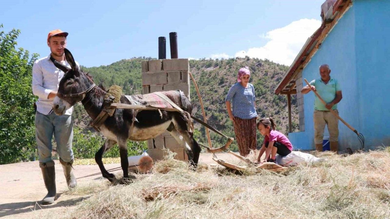 Sabahın erken saatlerinde başlayan düven sürme işi, akşam gün batımına kadar sürerken, çiftçiler ilkbahar sonlarında orakla kestikleri otları güneşte kurutarak saman haline getiriyor.