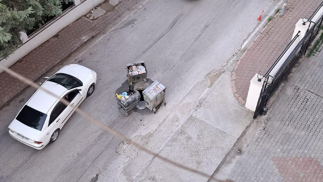 Güvenlik açısından tehlike oluşturan rögar açıklığını fark eden çevredeki vatandaşlar, olası kazaları önlemek için geçici bir çözüm olarak çöp konteyneri ile önlem aldı.