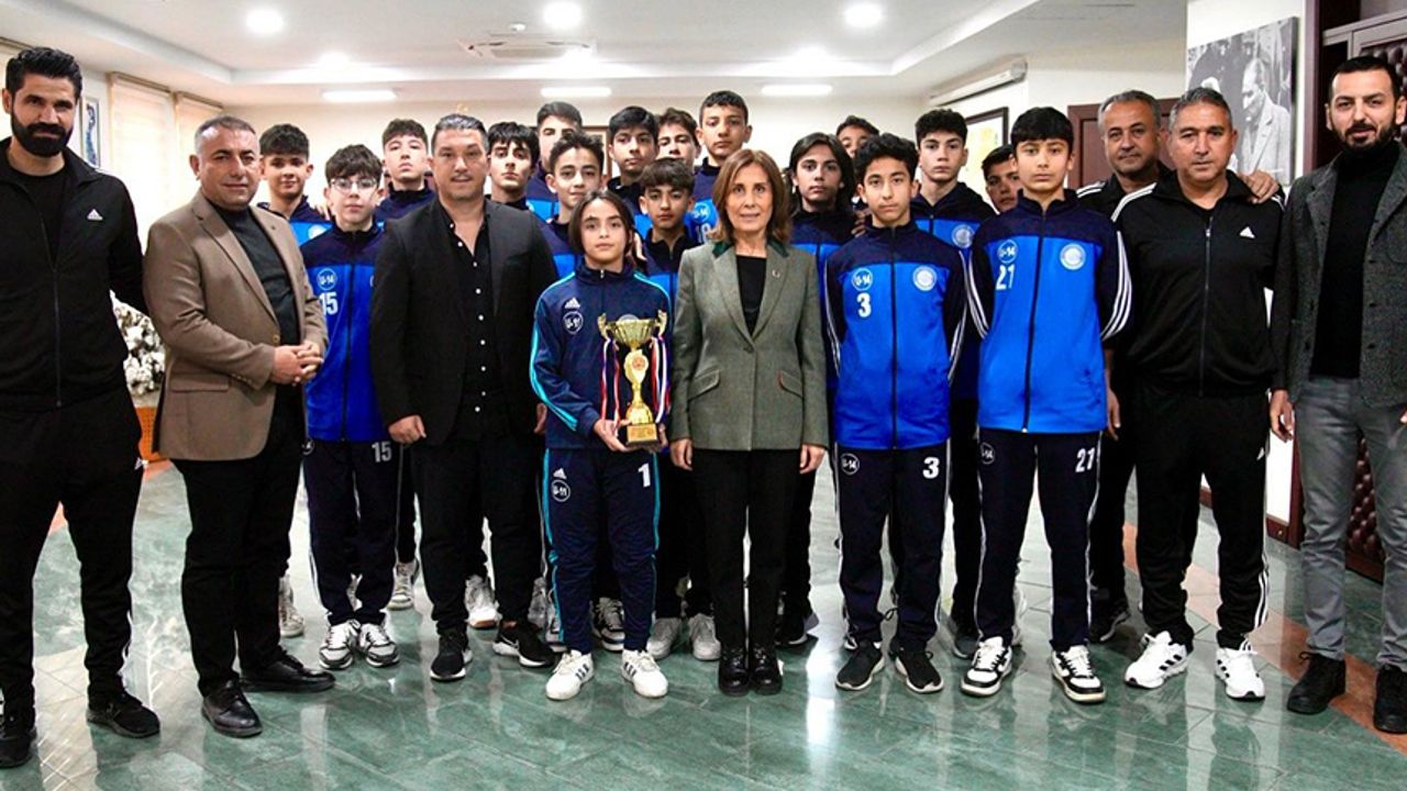 Adana birincisi olan ve Türkiye Şampiyonası’nda ilimizi temsil edecek olan Seyhan Belediyespor U-14 yaş futbol takımı, Seyhan Belediye Başkanı Oya Tekin’i ziyaret ederek şampiyonluk kupasını armağan etti. Gençlerin başarısı ile gurur duyduklarını dile getiren Başkan Tekin, teknik heyet ve futbolcuları kutlayıp başarılarının devamını diledi.