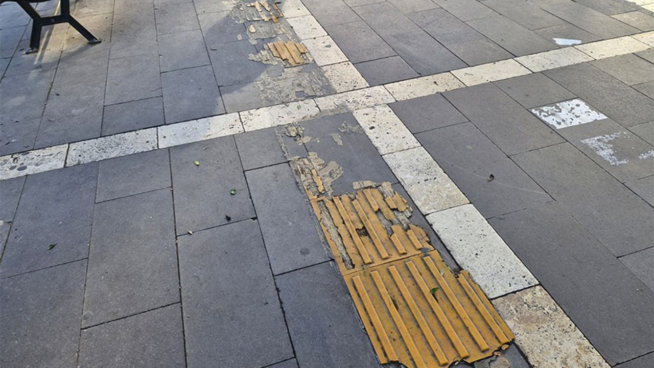 Kaldırımlarda bulunan sarı parkelerin yer yer tamamen parçalandığı, bazı bölümlerde ise yüzeyin neredeyse yok olduğu dikkat çekiyor. Baston yardımıyla ilerleyen görme engelliler için hayati öneme sahip olan bu dokulu parkelerin işlevini kaybetmesi, günlük yaşamı güçleştiriyor.