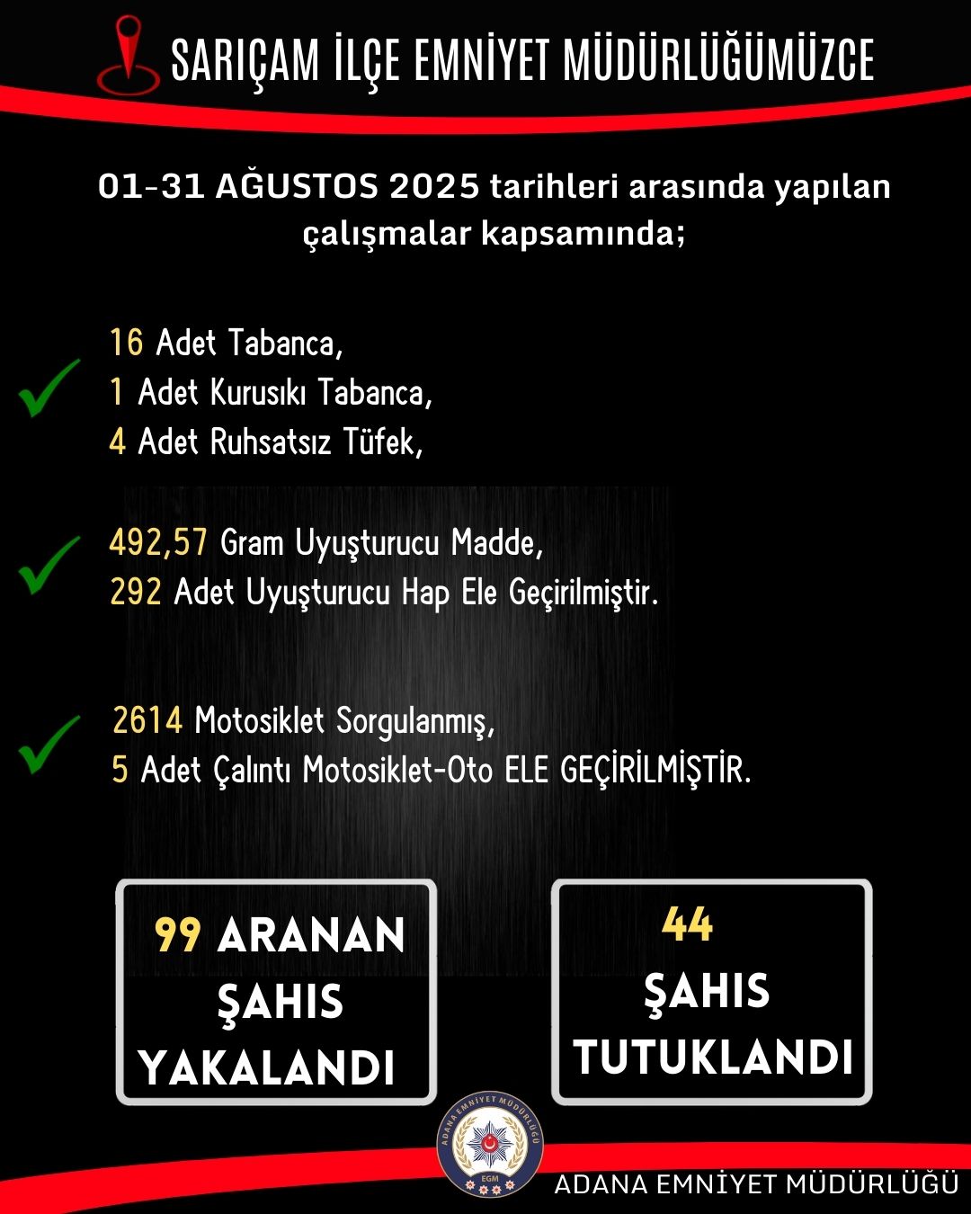 Sarıçam İlçe Emniyet Müdürlüğü ekiplerinin Ağustos ayındaki çalışmalarında öne çıkan sonuçlar şöyle: