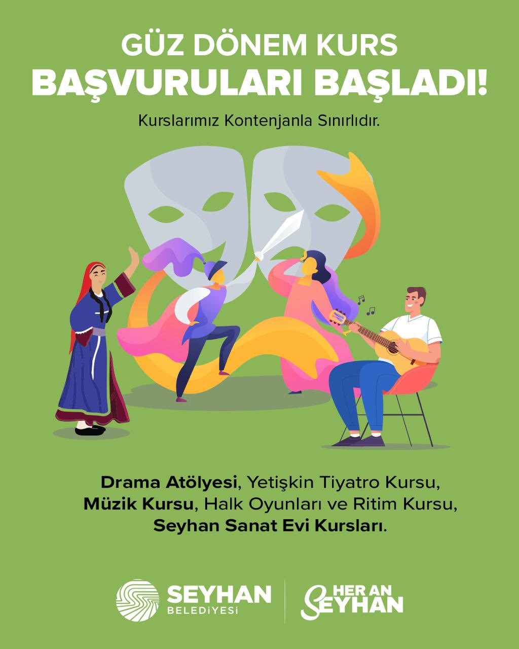 Yeni dönemde açılacak kurslar arasında Drama Atölyesi, Yetişkin Tiyatro Kursu, Müzik Kursu, Halk Oyunları ve Ritim Kursu ile Seyhan Sanat Evi’nde düzenlenecek çeşitli sanat kursları yer alıyor.