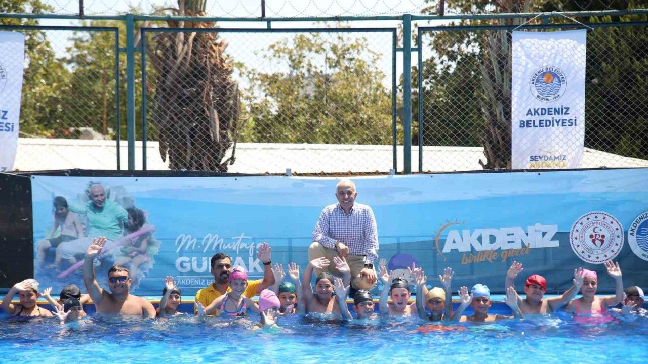 Akdeniz ilçesinde artık geleneksel hale gelen ve her yaz yüzlerce çocuğun ücretsiz yüzme öğrendiği, arkadaşlarıyla da yaz sıcağının keyfini çıkardığı kursların bu yılki ayağı yoğun ilgi altında gerçekleşiyor. Bu çerçevede Kültür Sosyal İşler Müdürlüğünce Madımak Barış ve Kardeşlik Parkı içine portatif bir yüzme havuzu kuruldu. Uzman eğitmenler ve cankurtaranlar gözetiminde başlayan kursa, yüzlerce çocuk başvurdu. Akdeniz Belediyesinin park içine kurduğu yüzme havuzunu ziyaret eden Belediye Başkanı Mustafa Gültak, çocuklarını kursa getiren annelerle sohbet etti. Ardından havuzda eğitim gören çocuklarla bir araya gelen Gültak, yetkilerden kursla ilgili bilgiler aldı.