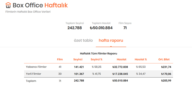 İzleyicilerin 141 bin 421’i yabancı filmleri, 101 bin 367’si ise yerli filmleri izlemeyi tercih etti. Hasılatın filmler arasında dağılımına bakıldığında bir haftalık hasılatın yüzde 65,53’ü yabancı filmlerden yüzde 34,47’si yerli filmlerden elde edildi. Ortalama bilet fiyatı ise 205,99 TL olarak ölçüldü.