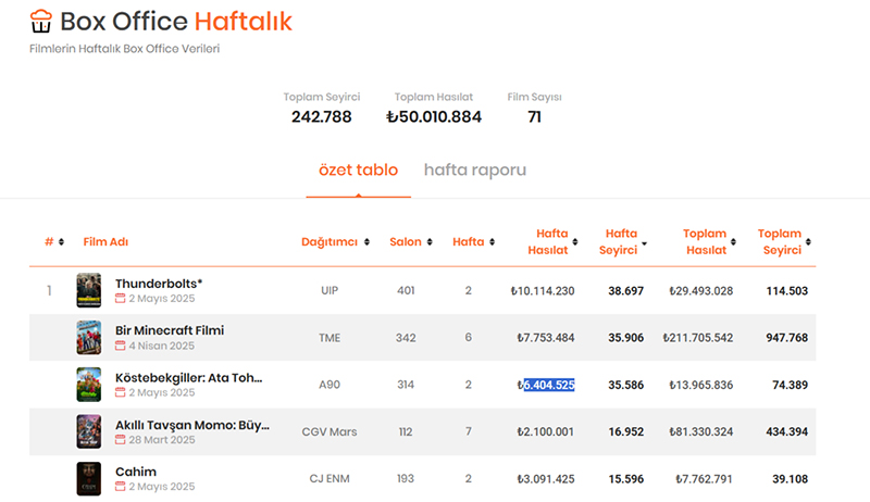 Bir haftada en çok izlenen üç filme bakıldığında listenin birinci sırasını 2 Mayıs’ta gösterime giren 401 salonda izleyiciyle buluşan Thunderbolts* filmi oldu. Filmi bir haftada 38 bin 697 kişi izlerken 10 milyon 114 bin 230 TL haftalık hasılat elde edildi.