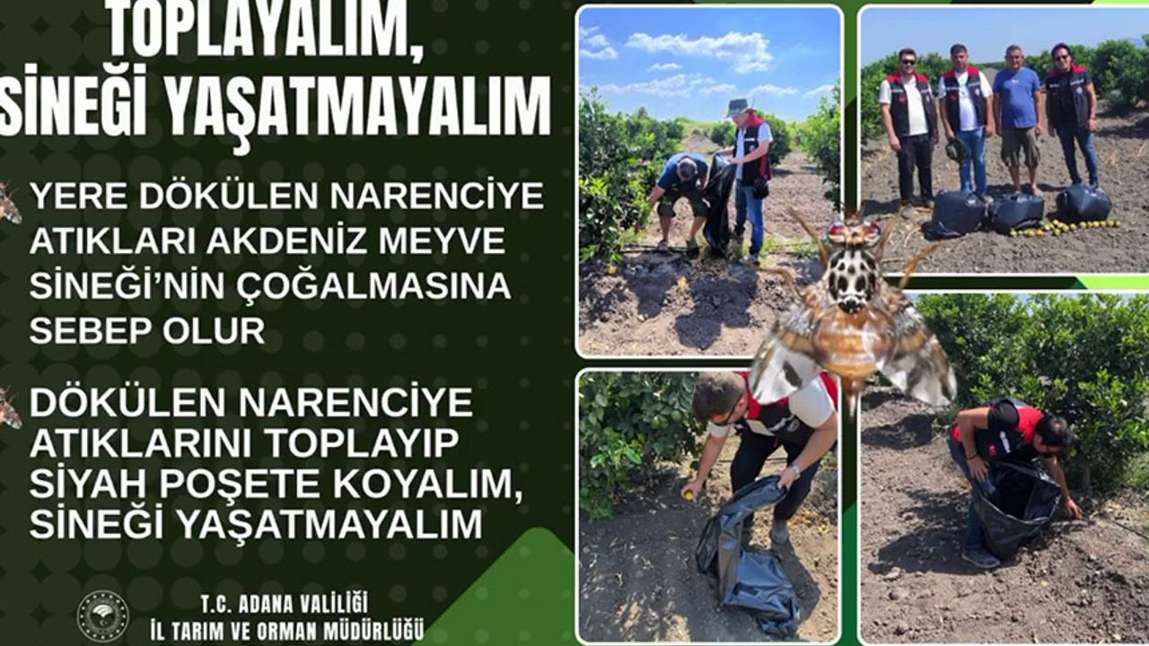 Adana İl Tarım ve Orman Müdürlüğü, halkı bilinçlendirmek amacıyla şu çağrıyı yaptı: “Yere dökülen meyve atıklarını toplayıp siyah poşete koyalım, sineği çoğaltmayalım.” Bu yöntemle Akdeniz Meyve Sineği’nin çoğalmasının önüne geçilerek hem meyve üreticilerinin hem de tüketicilerin zarar görmesi engellenmiş olacak.