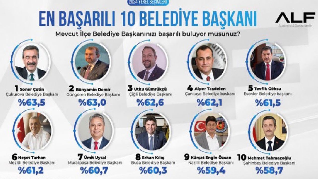 ALF Araştırma Şirketi 20 Ekim-3 Kasım 2023 tarihleri arasında 14 bin 200 kişiye çatı araştırma yöntemiyle 30 büyükşehirdeki ilçelerde memnuniyet araştırması yaptı. Katılımcılara geçtiğimiz yerel seçimlerden bu yana belediye başkanının performans, belediye hizmet kalitesi ve halkla iletişimine yönelik sorular soruldu ve en yüksek oranı alan 10 belediye başkanı sıralandı. Buna göre Çukurova Belediye Başkanı Soner Çetin, yüzde 63,5 oranıyla Türkiye’nin en başarılı belediye başkanı seçildi.