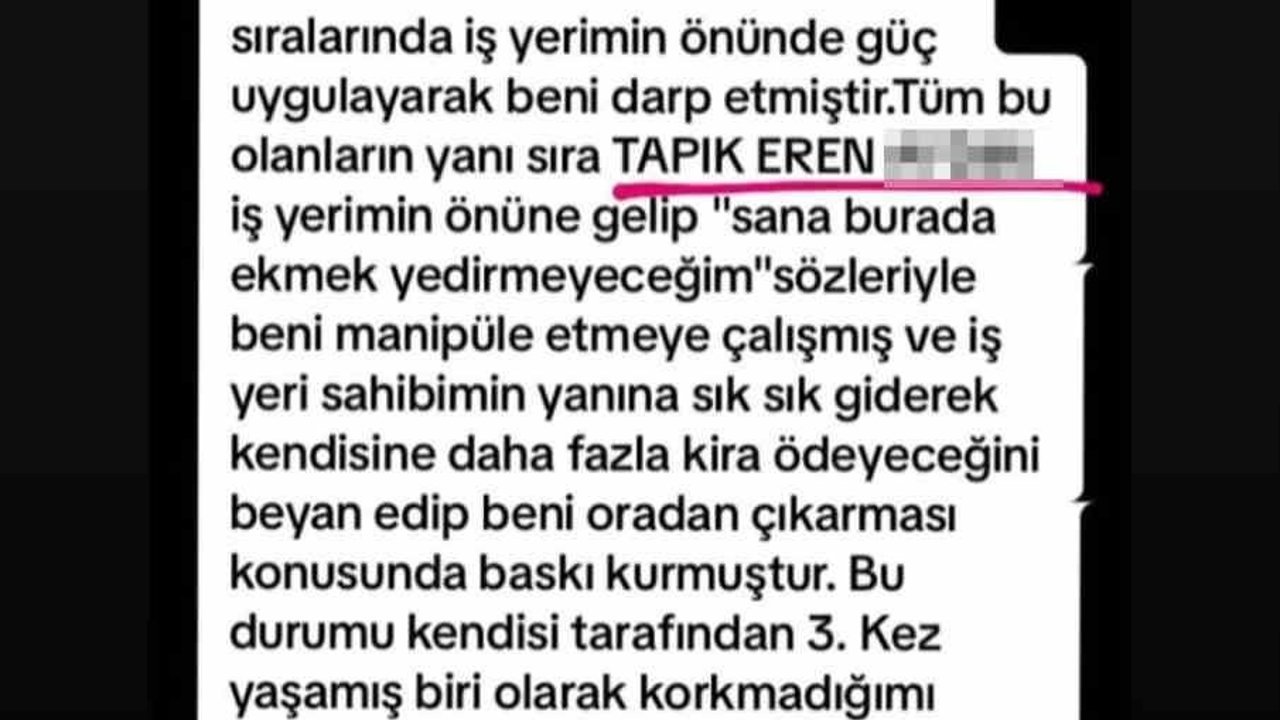 Hilal D. sosyal medya hesabından, “Bu iş yerini açtığım günden bu yana zaman zaman Tapık Eren A. tarafından iş yerimde gerek sözlü gerekse fiziki şiddete maruz kaldım. Bu kişi iş yerimi kapatmama yakın saatlerde yalnız olduğumu gördükçe sözlü bir şekilde beni taciz etmiş üzerime yürümüş tehditler savurmuş, daha da ileri giderek 17 Mart günü 02.20 sıralarında iş yerimin önünde bana güç uygulayarak beni darp etmiştir. Tüm bu olanların yanı sıra Tapık Eren A. iş yerimin önüne gelip ’sana burada ekmek yedirmeyeceğim’ sözleriyle beni manipüle etmeye çalışmış ve iş yeri sahibimin yanına sık sık giderek kendisine daha fazla kira ödeyeceğini beyan edip beni oradan çıkarması için baskı kurmuştur. Bu süreci 3 kez kendisi tarafından yaşadığımı ve işime devam edeceğimi, hakkımı hukuki yollarla arayacağımı belirtmek isterim” dedi.