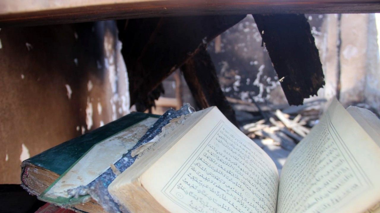 Evi tamamen yanan Ali Aydoğan, “Bu Kur’an-ı Kerim’ler babama aitti. Evden sadece bunlar çıktı, başka hiçbir şey sağlam kalmadı. Bir tek Kur’an-ı Kerim’ler sağ kaldı” dedi.