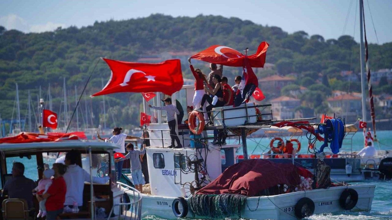 Cumhuriyet’in 100. yıl kutlamaları dahilinde Ayvalık Armutçuk Sahilinde buluşan yaklaşık 100 adet gezi ve balıkçı teknesi bayraklar ile süslendi. Burada bir araya gelen tekneler daha sonra marşlar eşliğinde yaklaşık bir saatlik bir seyir ile Cumhuriyet Meydanı önüne kadar kortej yaptılar. Tekneler resmi çelenk sunumu törenlerinin ardından karada bulunan kalabalığa bayrakları ile görsel şölen sundular.
