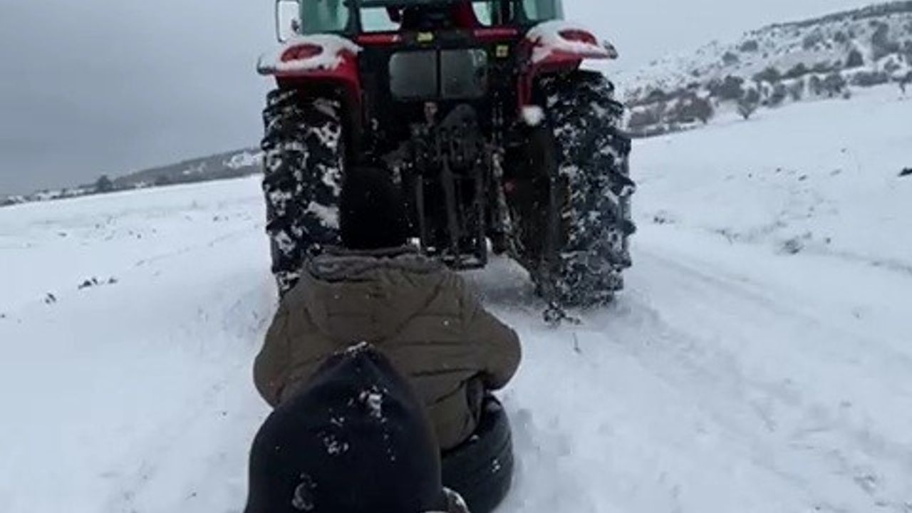 Olay, Eskipazar ilçesine bağlı Bölükören köyünde meydana geldi. Kar yağışıyla birlikte beyaza bürünen köy yollarında karın keyfini çıkarmak isteyen iki genç, traktörün arkasına iple bağladıkları eski araç lastiklerine oturarak kayak yaptı. Karla kaplı yolda hızla ilerleyen traktörün arkasında kayan gençler, eğlenceli halleriyle renkli görüntülere sahne oldu.