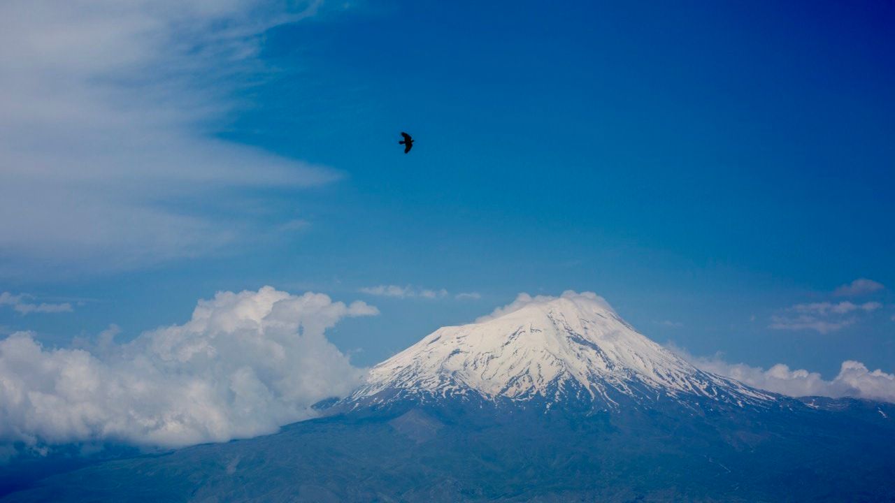 Ağrı’nın Doğubayazıt ilçesinde yer alan ve 5 bin 137 metre yüksekliğe sahip olan Ağrı Dağı, baharın gelişini kartpostallık manzaralarla karşılıyor. Zirvesindeki kalın kar tabakası ile çevresini saran bulutların birleşimi, ortaya nefes kesen bir doğa fotoğrafı çıkarıyor. Bölgedeki diğer tepeler arasında heybetli bir şekilde yükselen Ağrı Dağı, yoldan geçen sürücülere de eşsiz görsel şölen sunuyor.