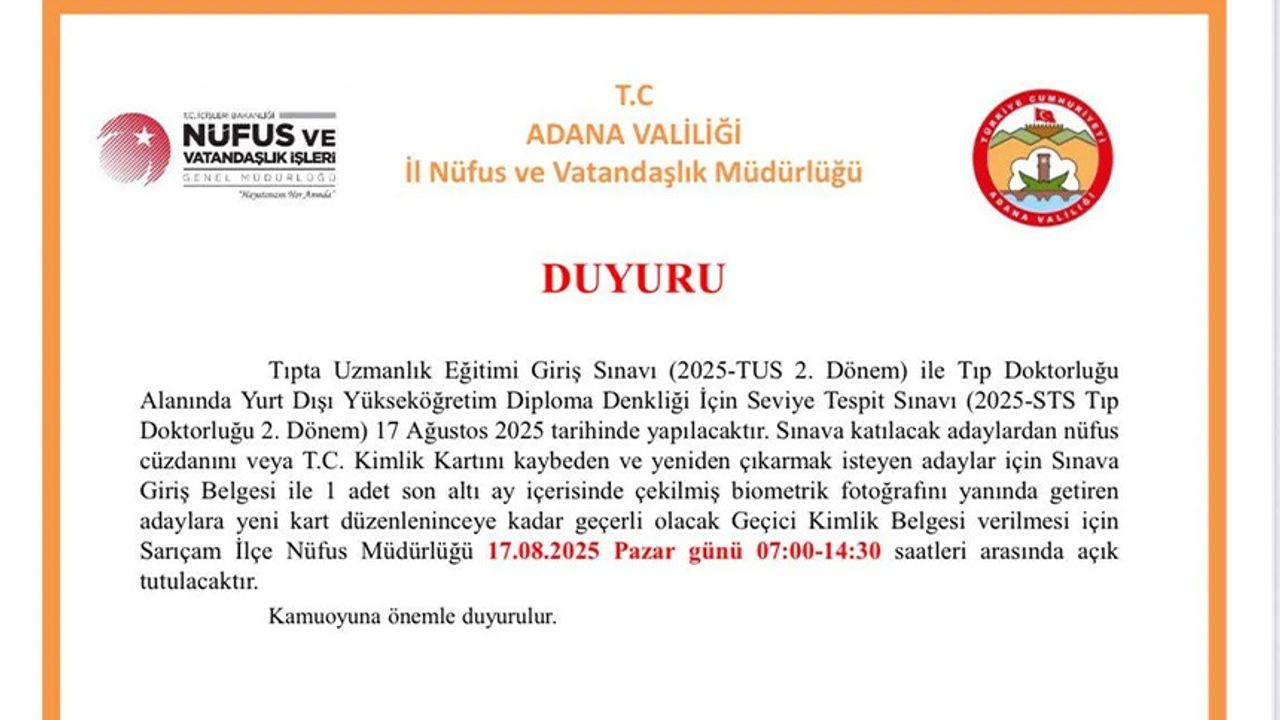 Adana Nüfus Müdürlüğü, 17 Ağustos 2025 Pazar günü yapılacak Tıpta Uzmanlık Eğitimi Giriş Sınavı (2025-TUS 2. Dönem) ile Yurt Dışı Yükseköğretim Diploma Denkliği Seviye Tespit Sınavı (2025-STS 2. Dönem) için sınav adaylarına yönelik önemli bir duyuru yaptı.