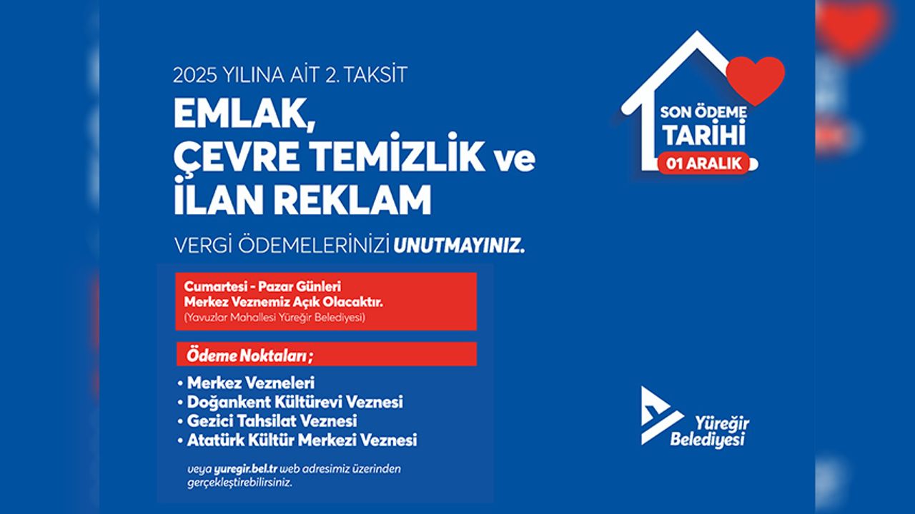 Ödemeler, Yüreğir Belediyesi merkez vezneleri, Doğankent Kültürevi Veznesi ve Gezici Tahsilat Veznesi aracılığıyla yapılabiliyor. Mükellefler ayrıca işlemlerini www.yuregir.bel.tr adresi üzerinden online olarak da gerçekleştirebiliyor.