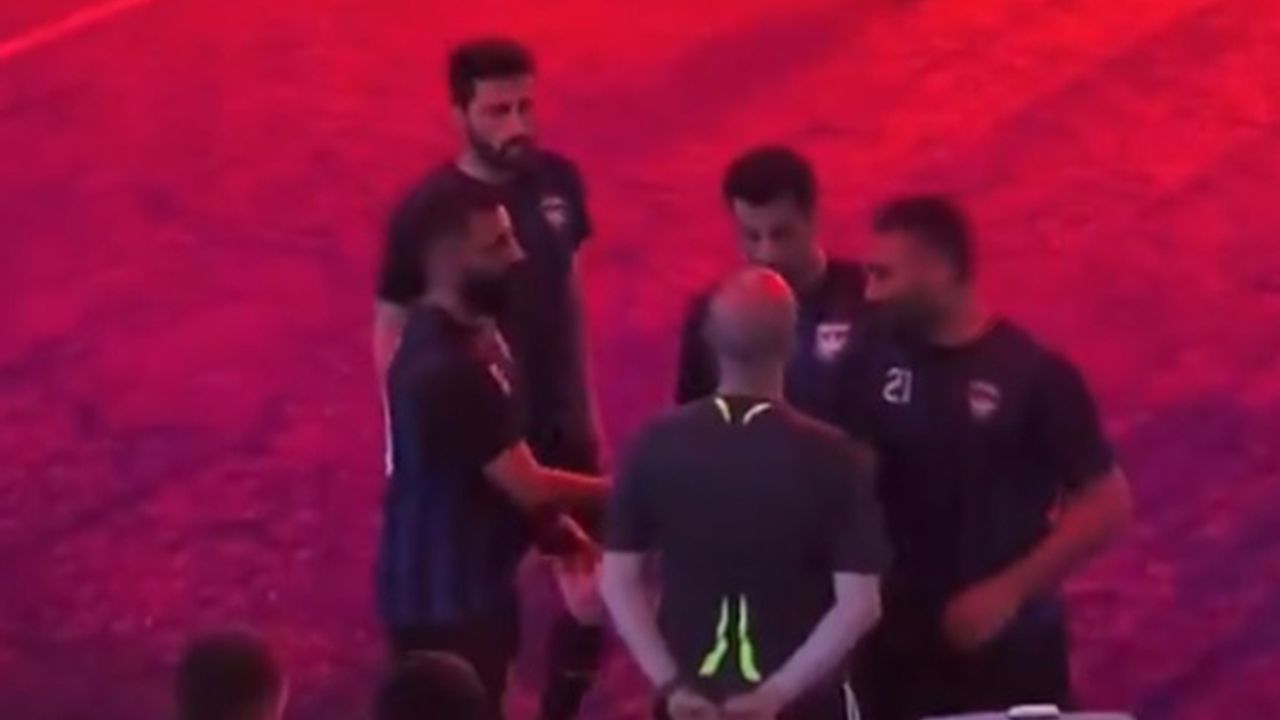 Gösteri maçında yan hakemle tartışma yaşayan Volkan Demirel, hakeme küfür ettiği iddiasıyla hakem Fırat Aydınus tarafından kırmızı kartla oyun dışı bırakıldı.