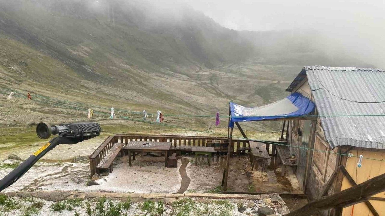 Doğu Karadeniz Yaylaları’nda yaz mevsimi sona ererken sonbaharın etkileri kendini göstermeye başladı. Çamlıhemşin ilçesine bağlı 2040 rakımdaki Hazindak Yaylası’nda yaşayan yaylacılar, sabah saatlerinde dolu yağışıyla uyandı. Yaylaların beyaza bürünmesiyle birlikte yaylacılar, olumsuz etkilenmemek için bir süre evlerinden çıkamadı.