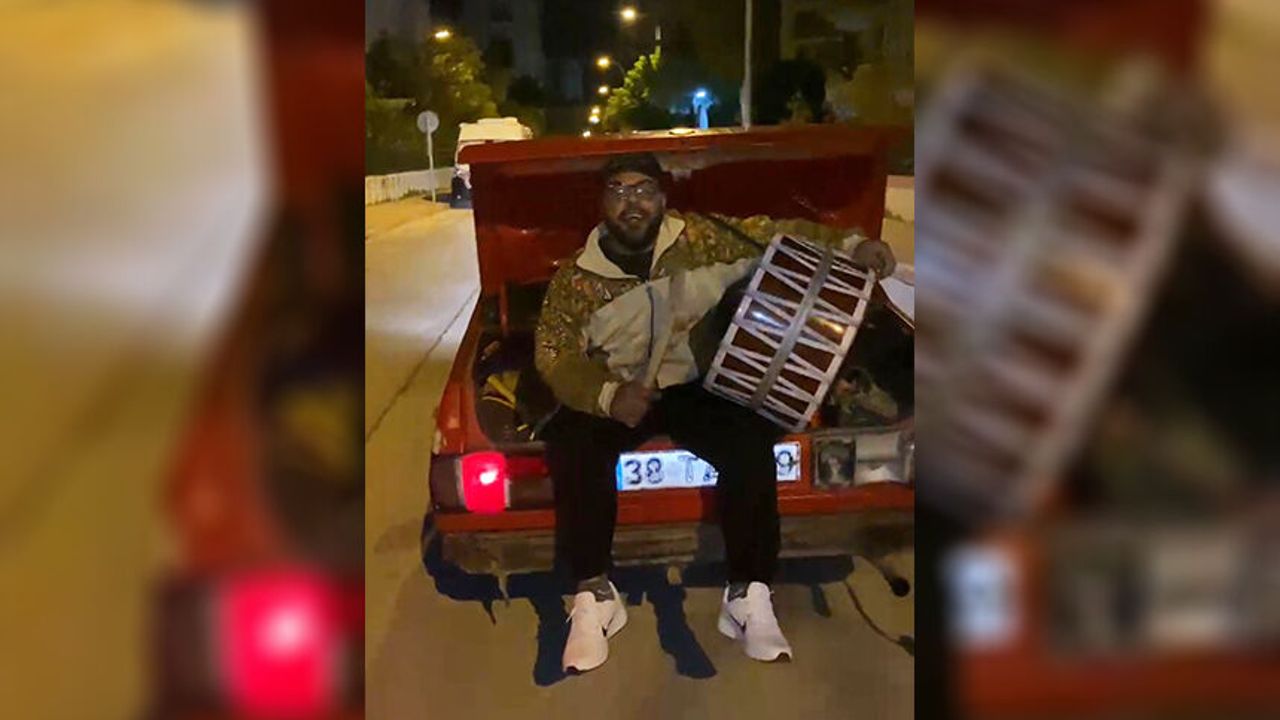 Arkadaşının kullandığı otomobilin bagajına oturdu; hem davul çaldı, hem de maniler