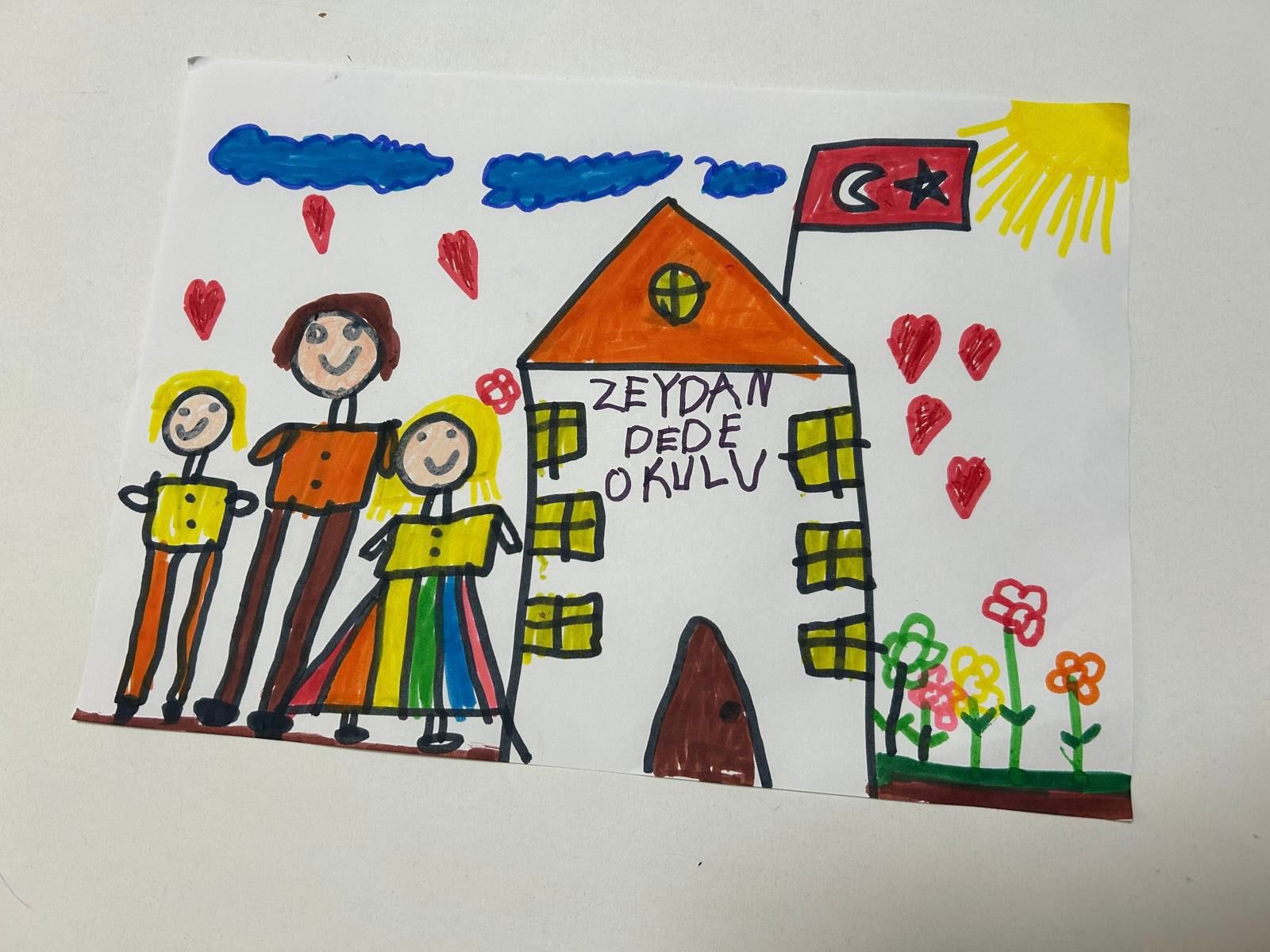 Bir öğrencinin çizdiği okul binasının üzerine “Zeydan Karalar Okulu” yazdığı görüldü.