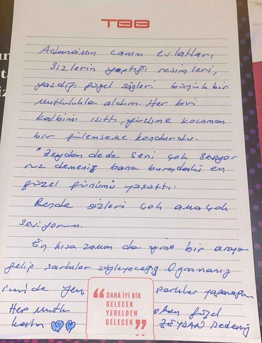 “Sizlerin yaptığı resimleri, yazdığı güzel sözleri büyük bir mutlulukla aldım. Her biri kalbimi ısıttı, yüzüme kocaman bir gülümseme kondurdu.”